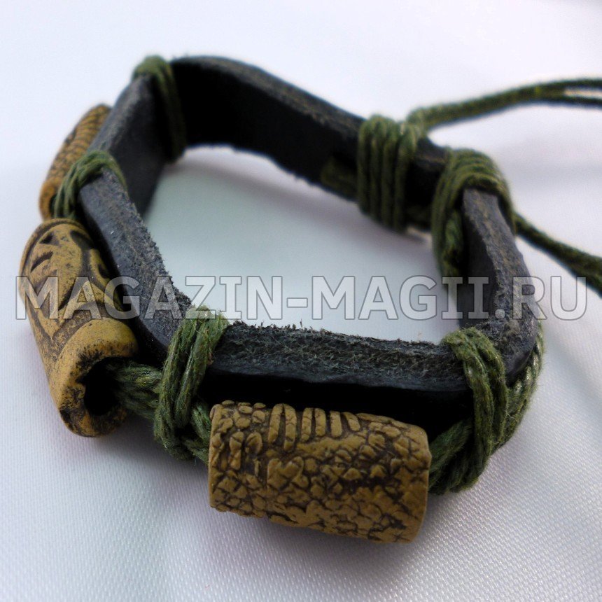 Браслет сделанный из темной кожи с деревянными украшениями, оплетенный цветной нитью. Подойдет как любителям разнообразных экстравагантных украшений, так и скромникам. Регулируемый ремешок позволит не волноваться о размере браслета.