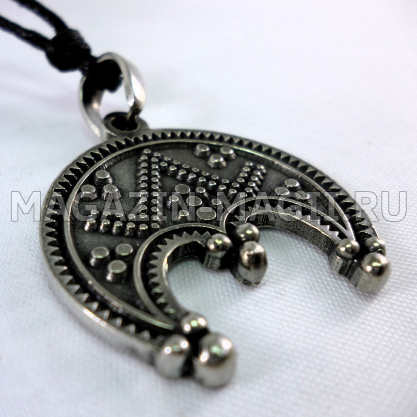 Это символ единения двух начал, мужского и женского, олицетворение продолжения рода. Данный оберег является сильным защитником от негативных воздействий, сглаза и порчи. В амулете зашифрован символ нарождающейся луны, это означает начало чего-то нового, развитие, движение вперед.