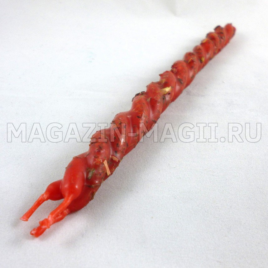 Свеча-скрутка на поиск и гармонизацию отношений - состоит из трёх красных маканых свечей ручной работы, скрученных между собой, выкатанных в смеси трав (тысячелистник, роза, одуванчик, душица, лаванда) и дополнительно облитых воском.